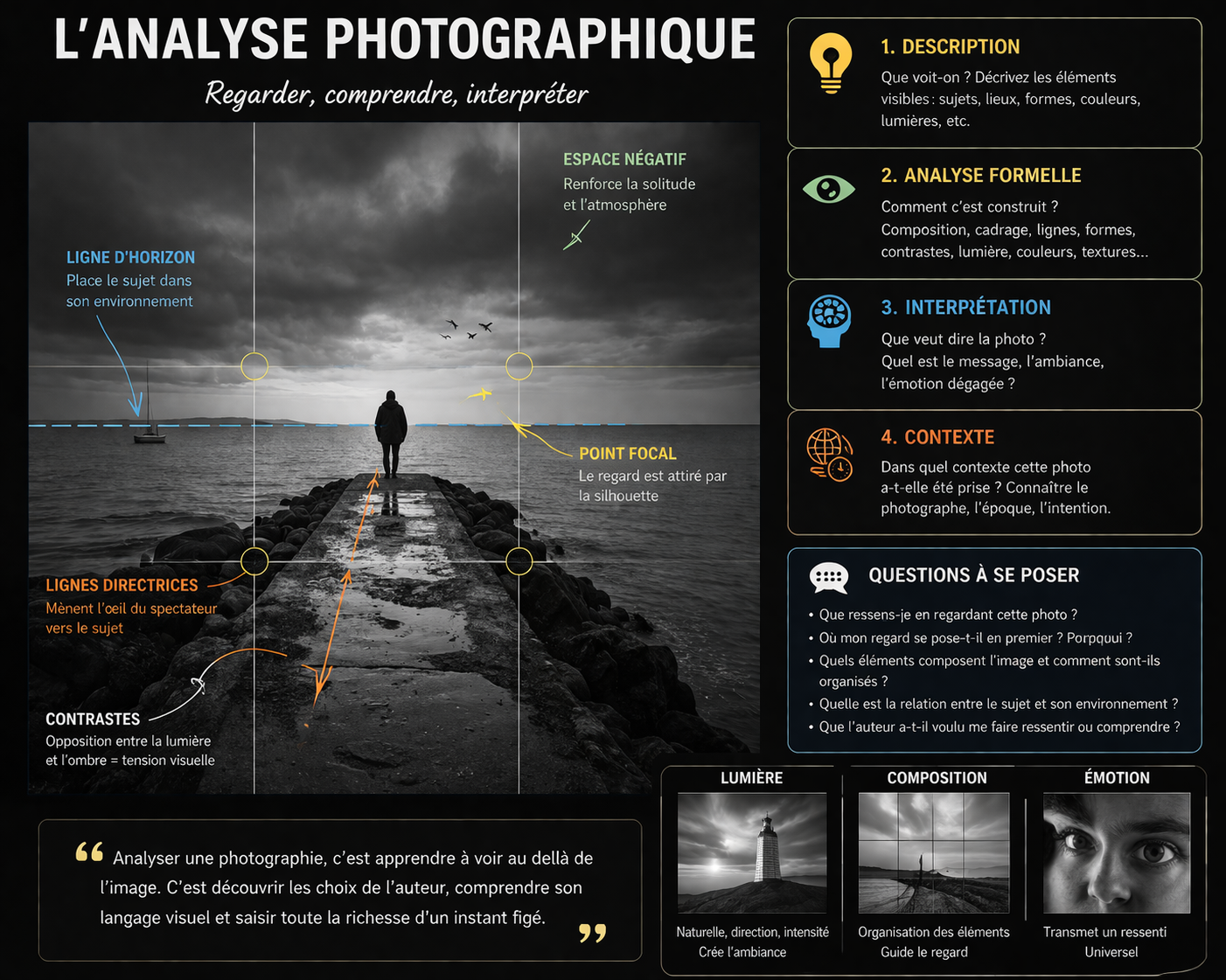 L'analyse photographique ne consiste pas seulement à voir ce qui est sur l'image, mais aussi à ressentir l'intention du photographe et l'impact de l'instant capturé.